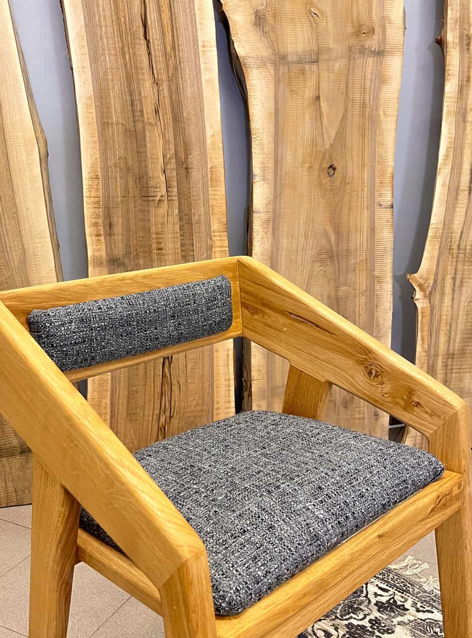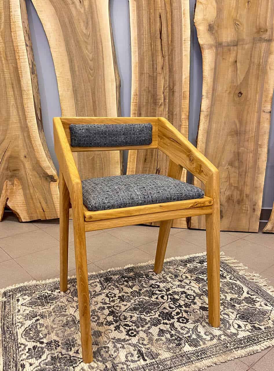 4. Kolorystyka: Drewno w naturalnym, ciepłym odcieniu harmonijnie współgra z szarą tkaniną siedziska, tworząc elegancką i uniwersalną całość, która łatwo dopasuje się do różnych stylów wnętrz.