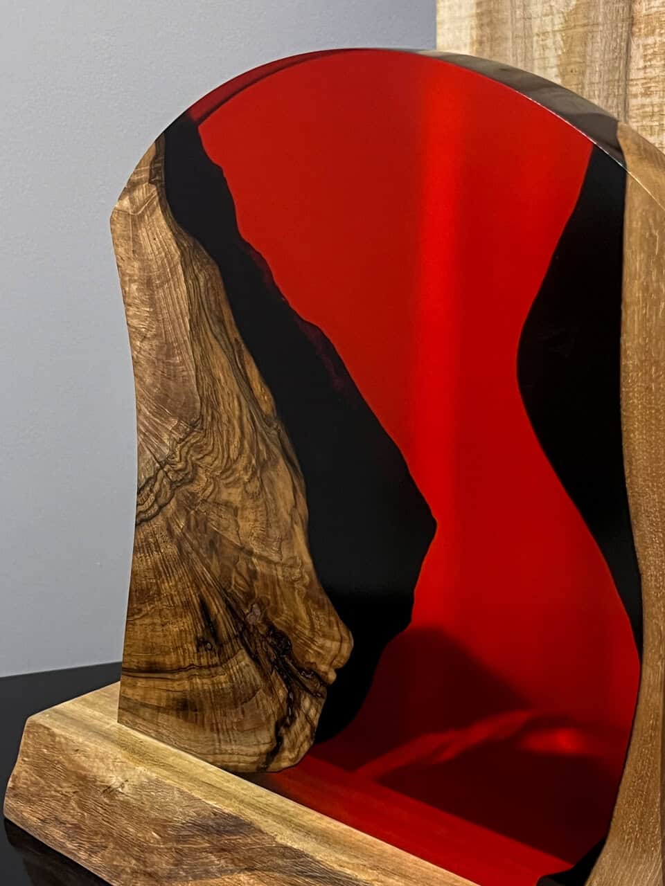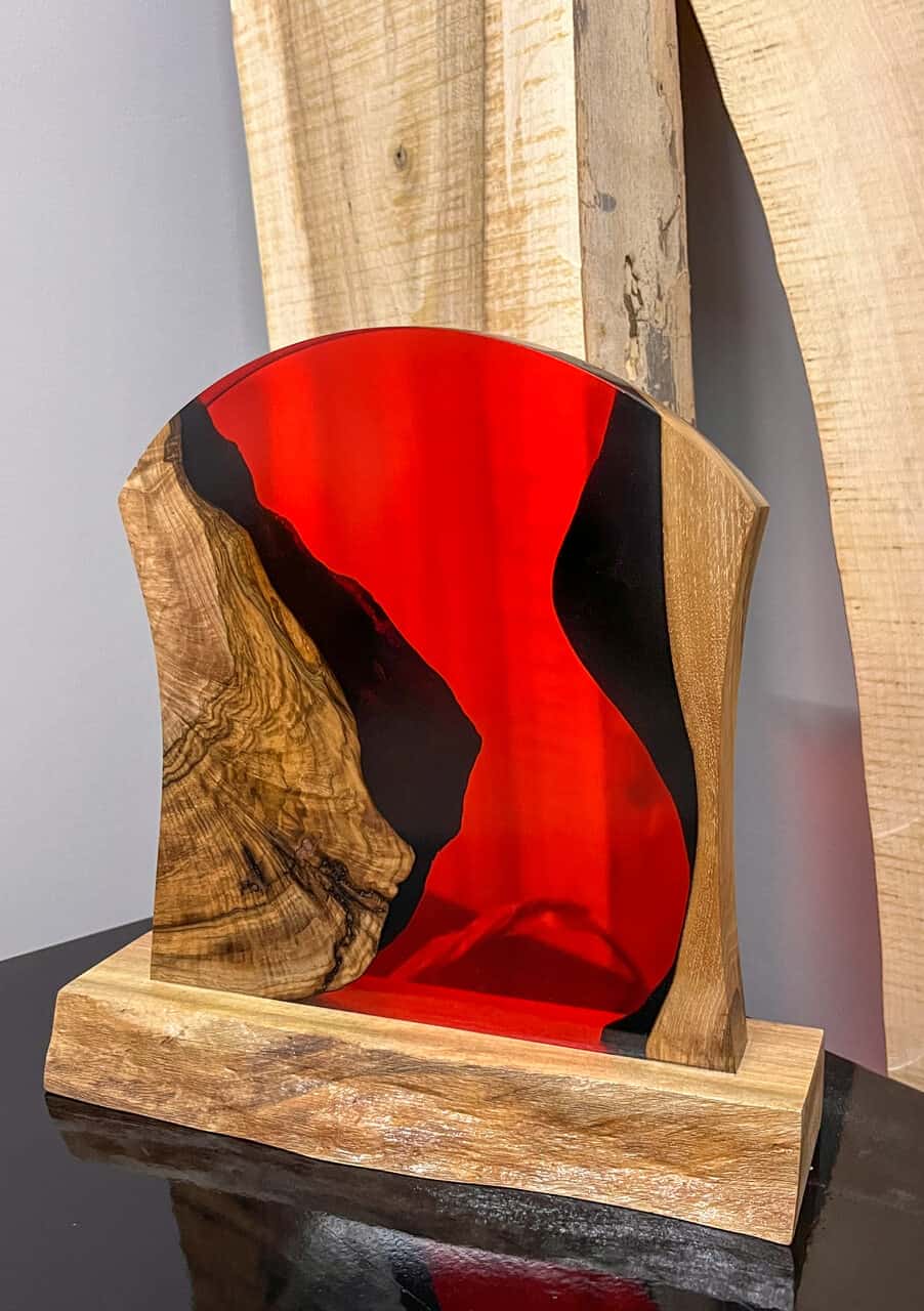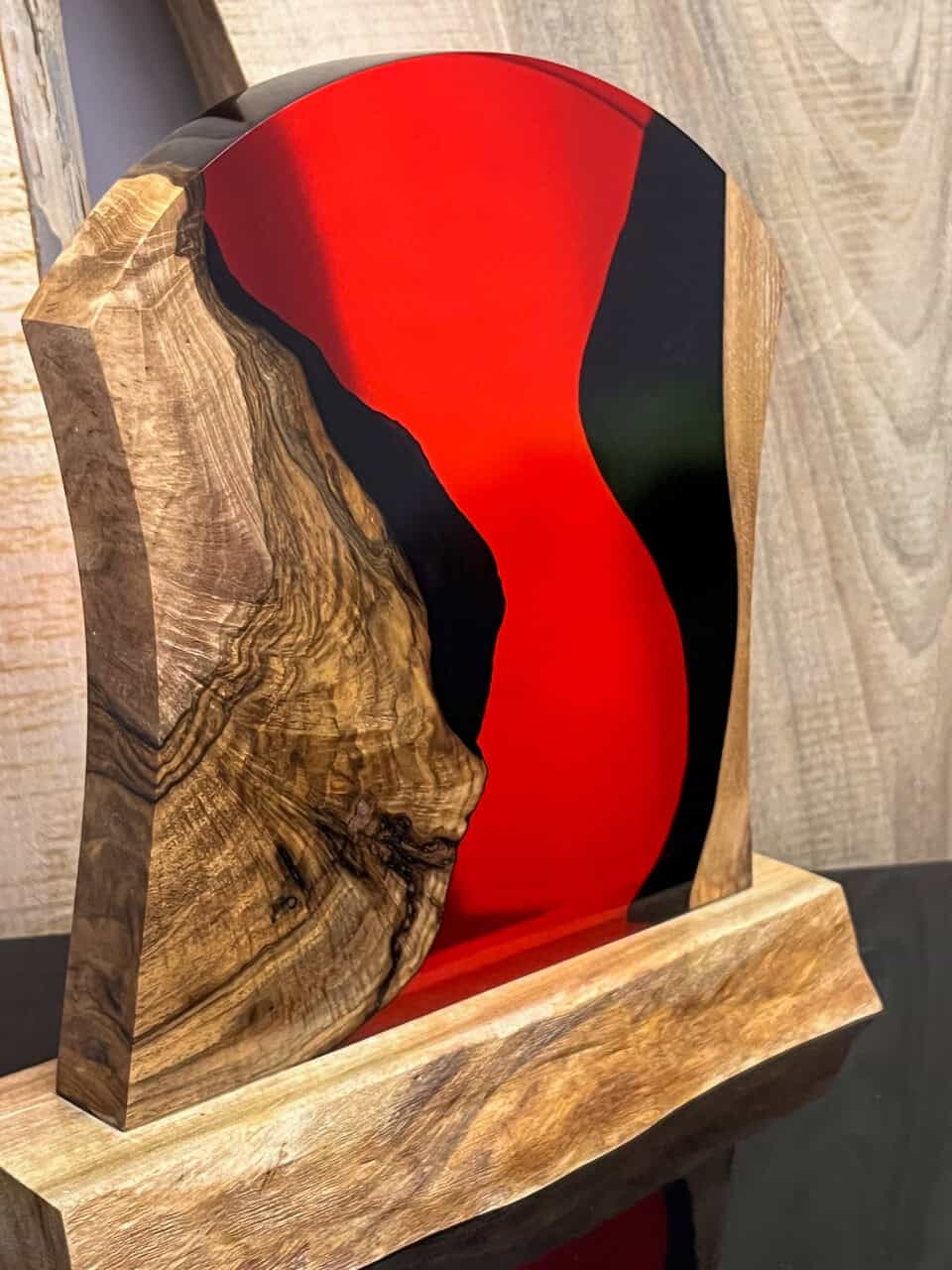 Lampa z orzecha z czerwoną żywicą Flame to połączenie naturalnej surowości drewna z artystycznym wyrazem nowoczesności.