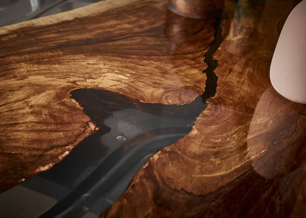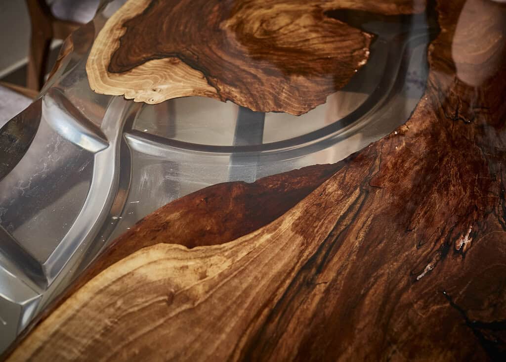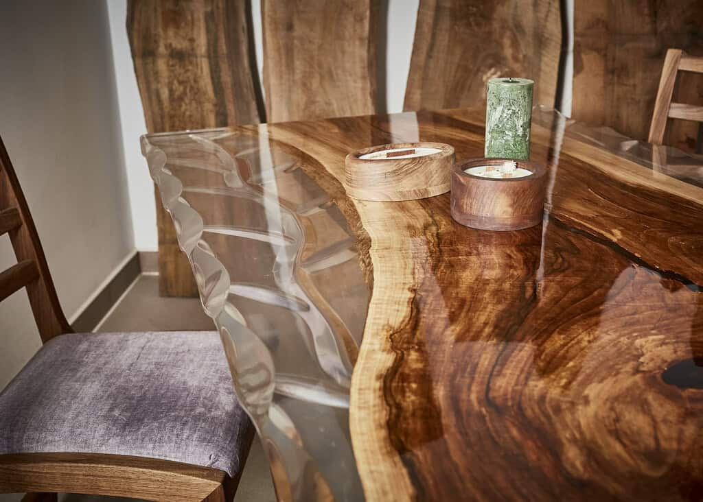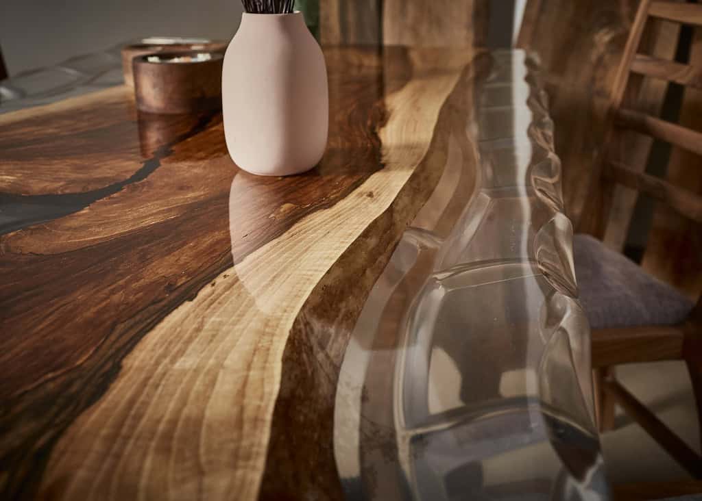 Stół Crystal jest unikalny dzięki naturalnym słojom drewna orzecha, które w połączeniu z przezroczystą żywicą epoksydową tworzą jedyny w swoim rodzaju wizerunek.