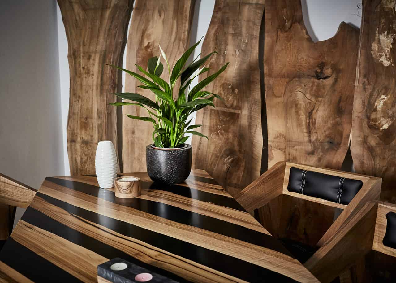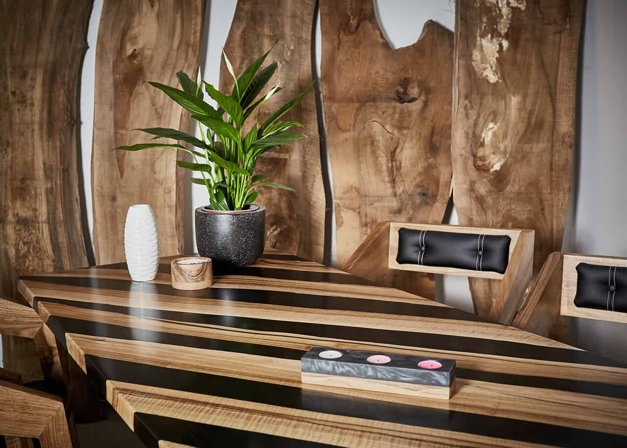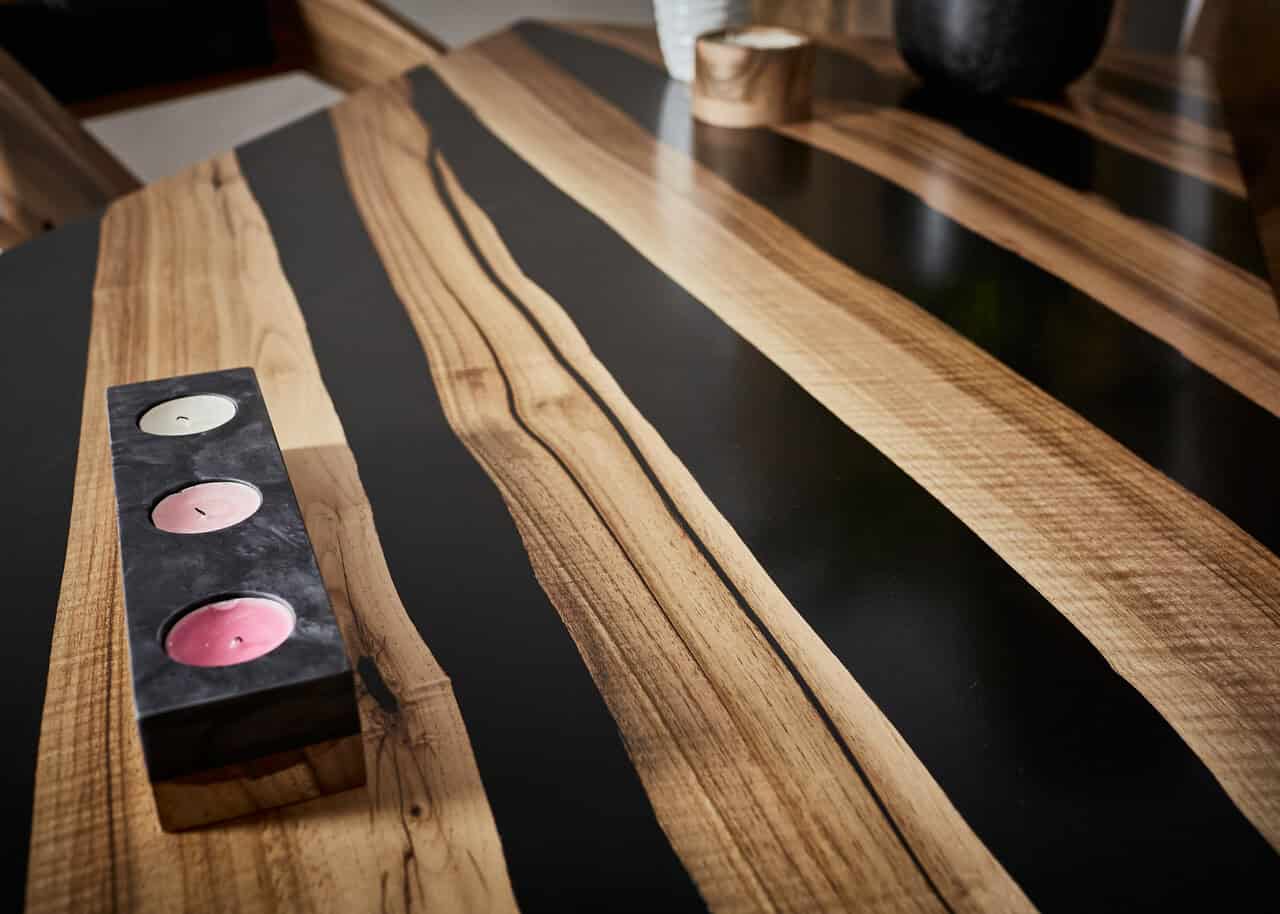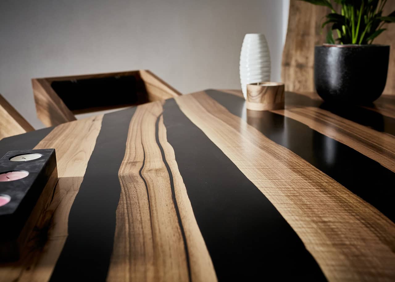 Stół do jadalni Czarny Agat jest wykonany z drewna orzecha i czarnej żywicy epoksydowej.