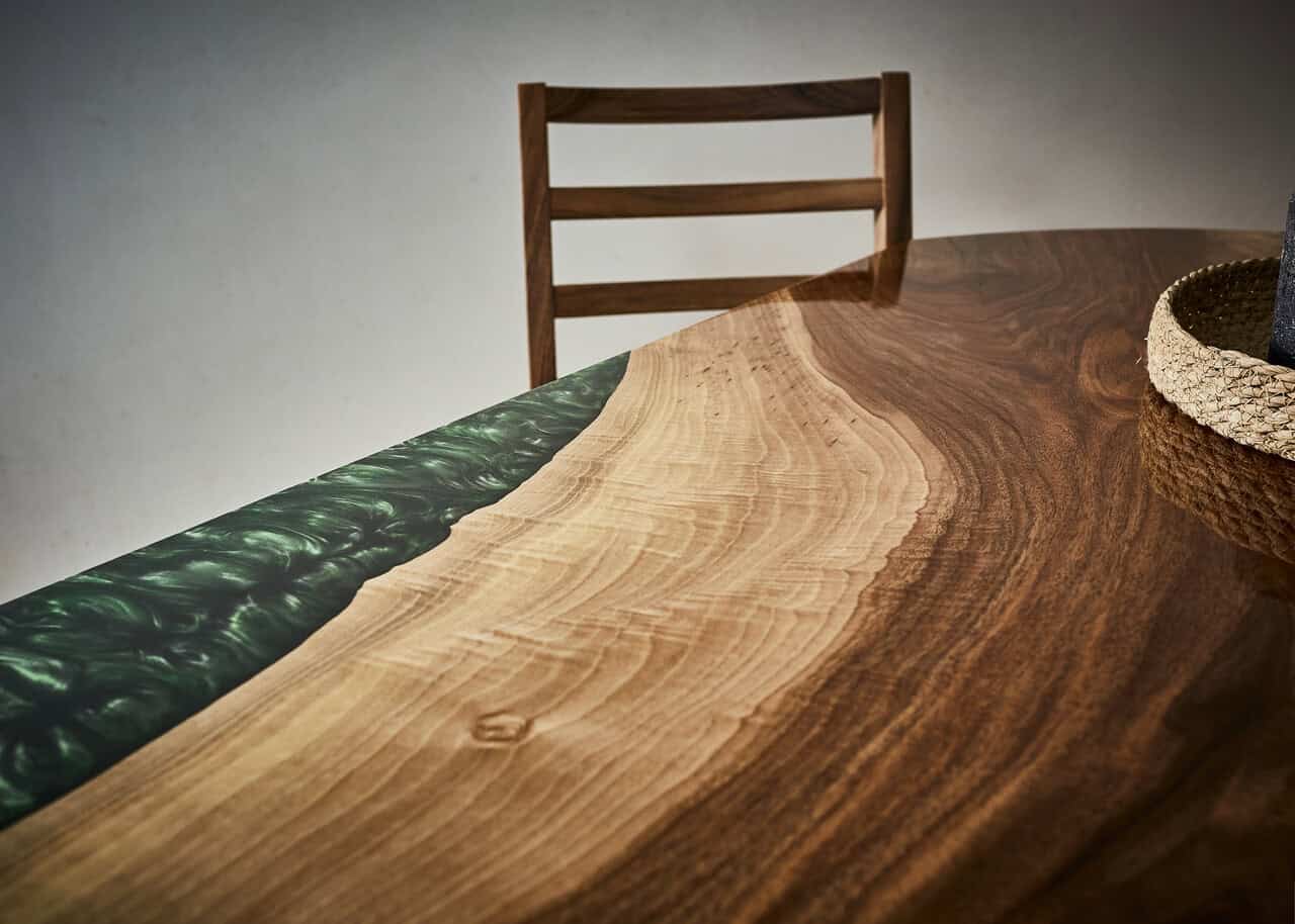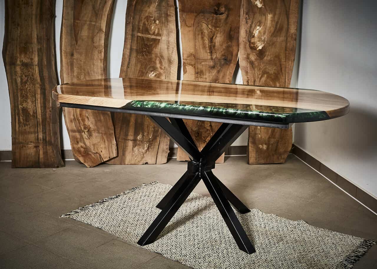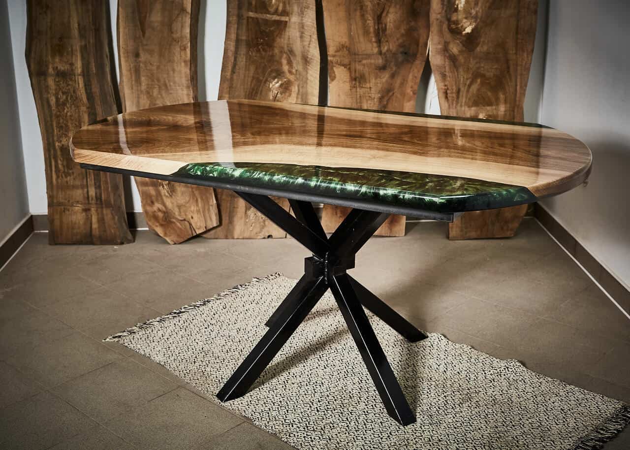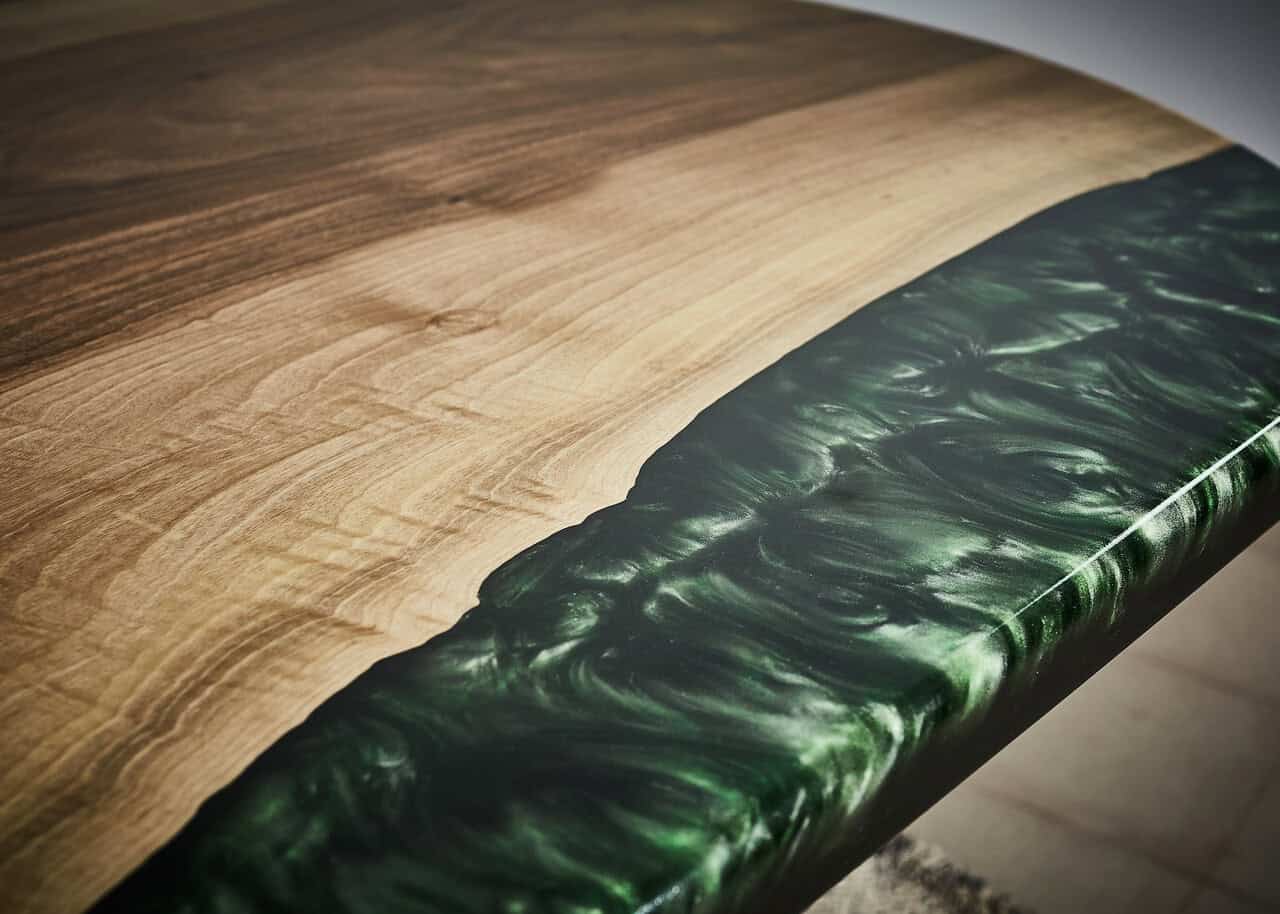 Stół Szmaragdowy Brzeg z orzecha i zielonej żywicy będzie doskonałym wyborem dla osób poszukujących niebanalnych i stylowych rozwiązań.