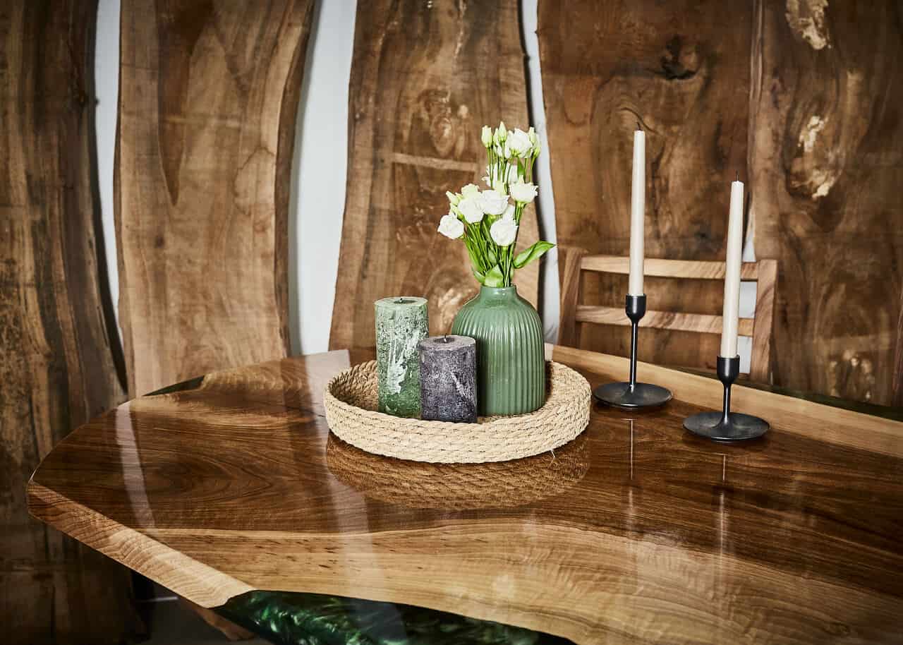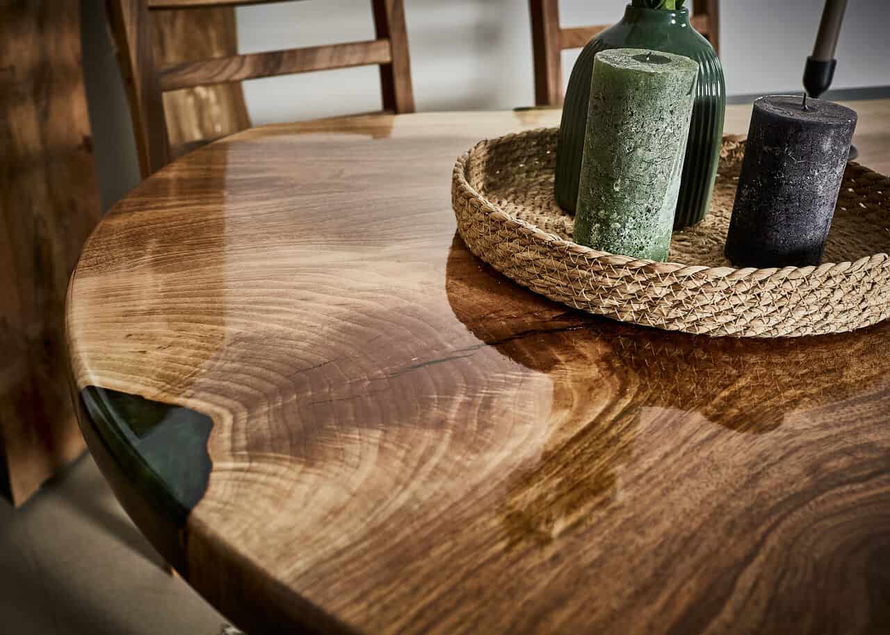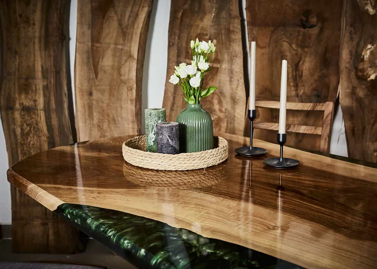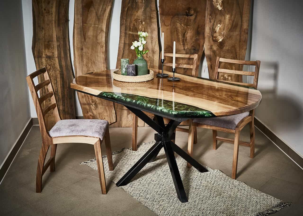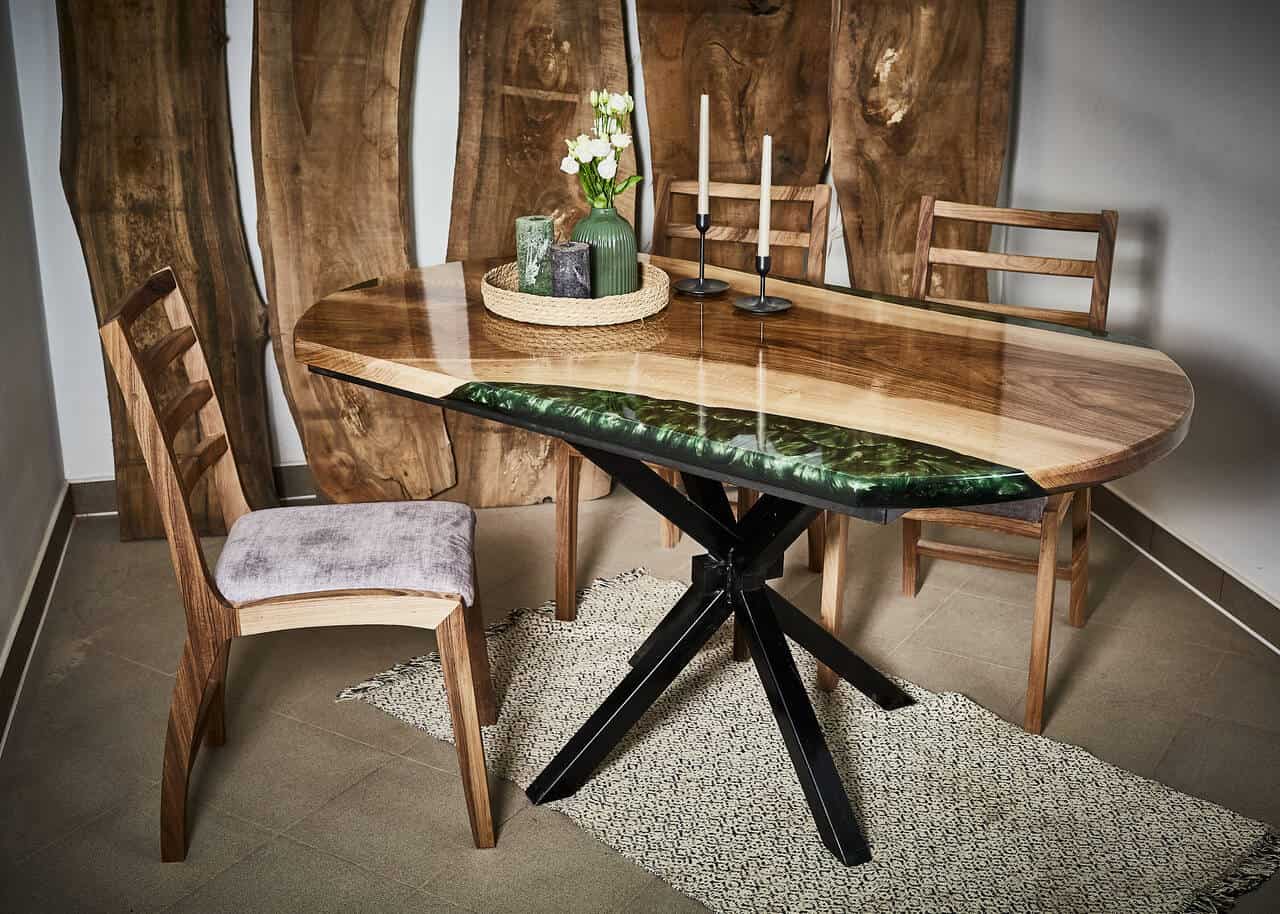 Stół Szmaragdowy Brzeg z orzecha i zielonej żywicy będzie doskonałym wyborem dla osób poszukujących niebanalnych i stylowych rozwiązań.