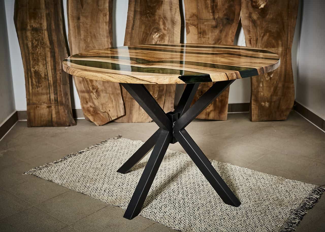Stół Szmaragd z drewna orzecha z zieloną żywicą epoksydową o okrągłym kształcie i średnicy 110 cm – mebel, który zachwyca swoim designem i elegancją.