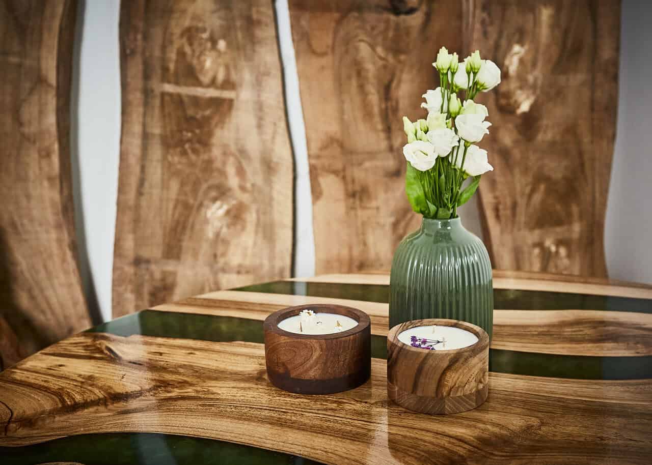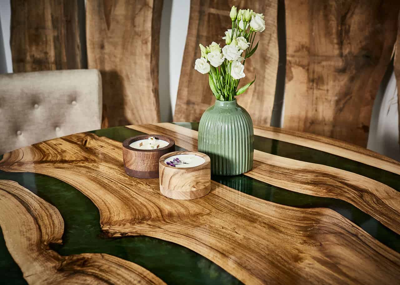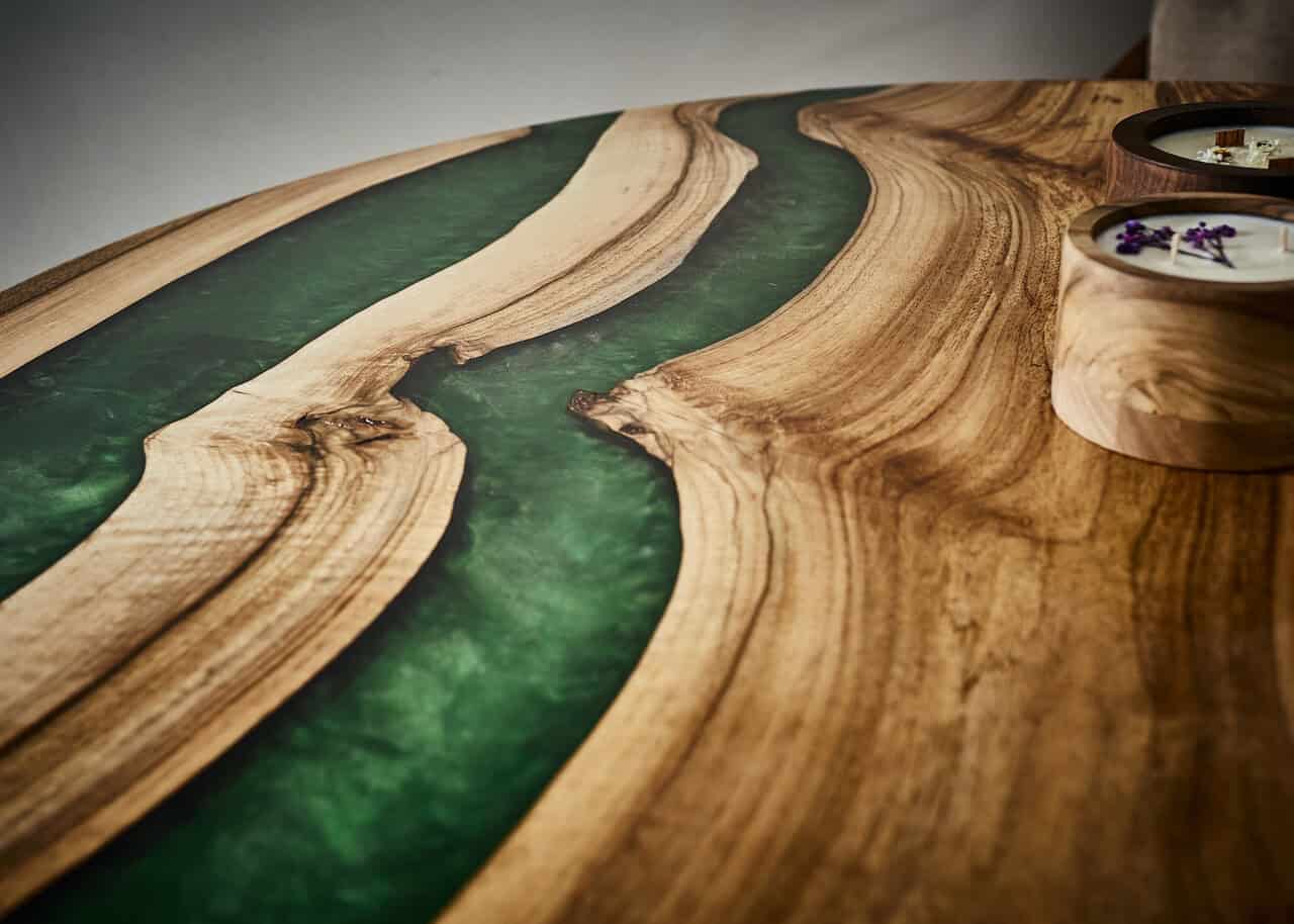 Blat, ręcznie wykonany z największą precyzją, prezentuje niepowtarzalny wzór, który podkreśla naturalne słoje drewna i dodaje mu głębi, gdyż szmaragdowa żywica epoksydowa dodaje estetycznego uroku.