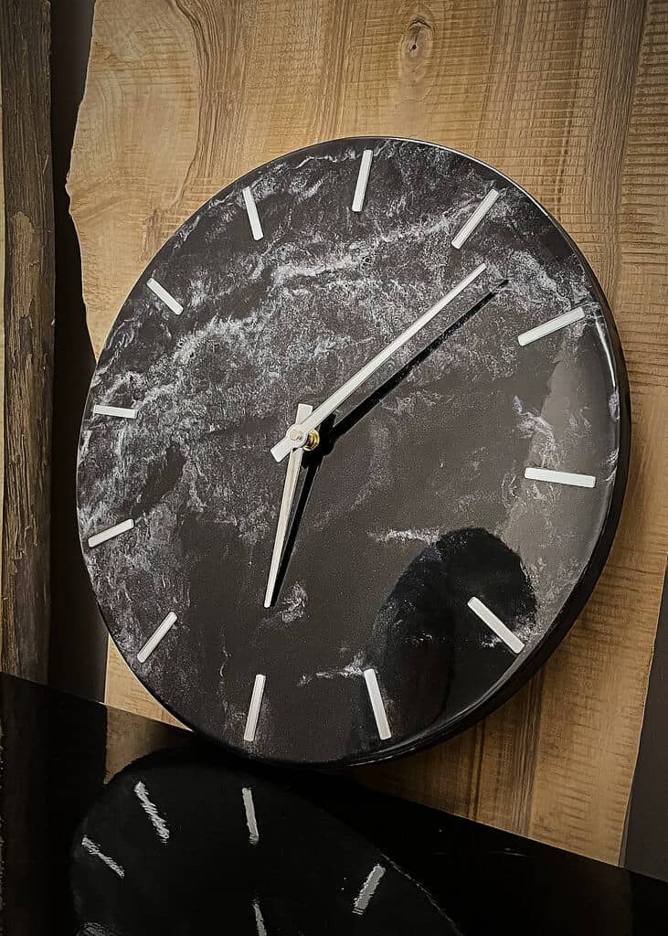 Przedstawiamy nasz elegancki zegar ścienny wykonany z żywicy epoksydowej w czarnym odcieniu. Taki zegar to doskonałe połączenie nowoczesnego designu i wyrafinowanej prostoty, które wniesie do Twojego wnętrza nutę luksusu i klasy.