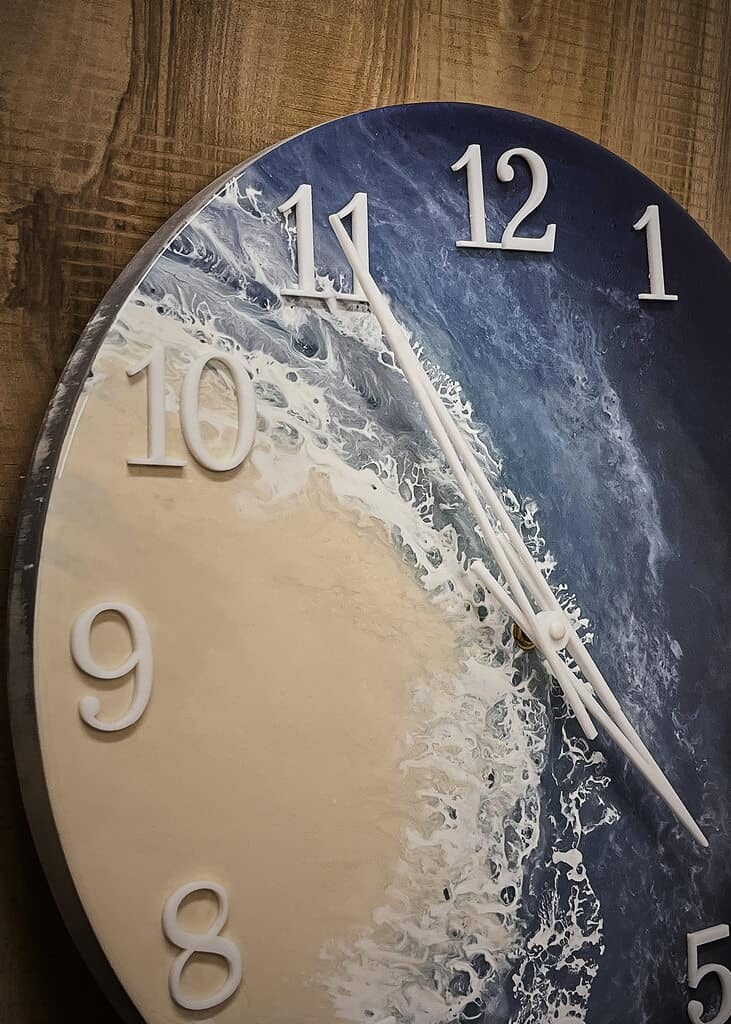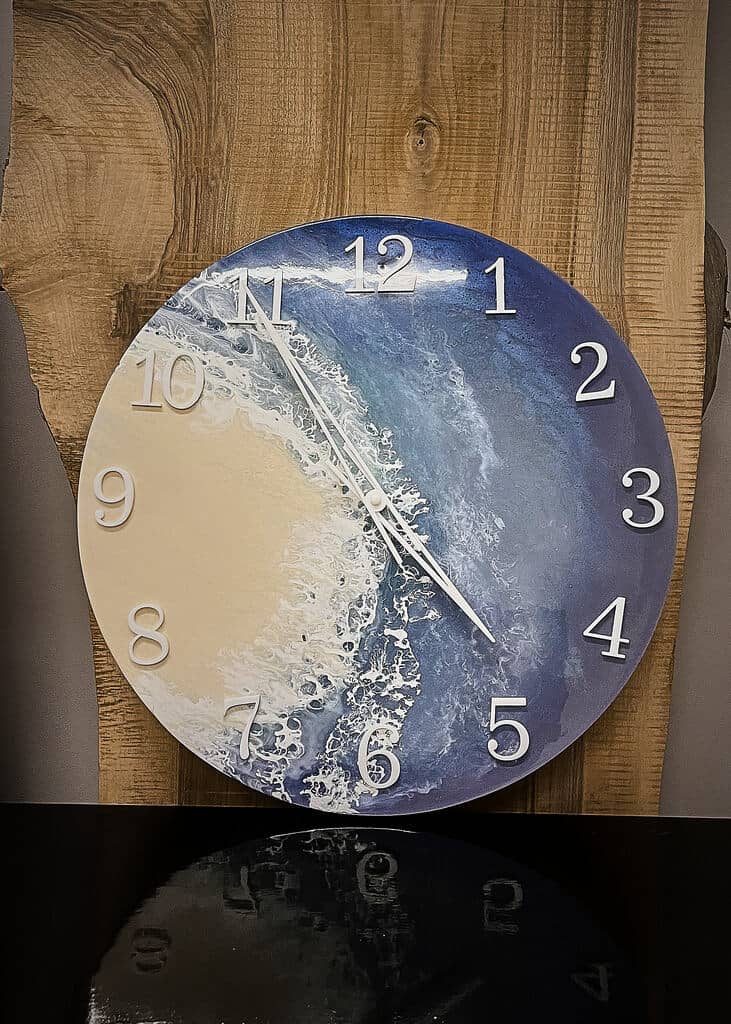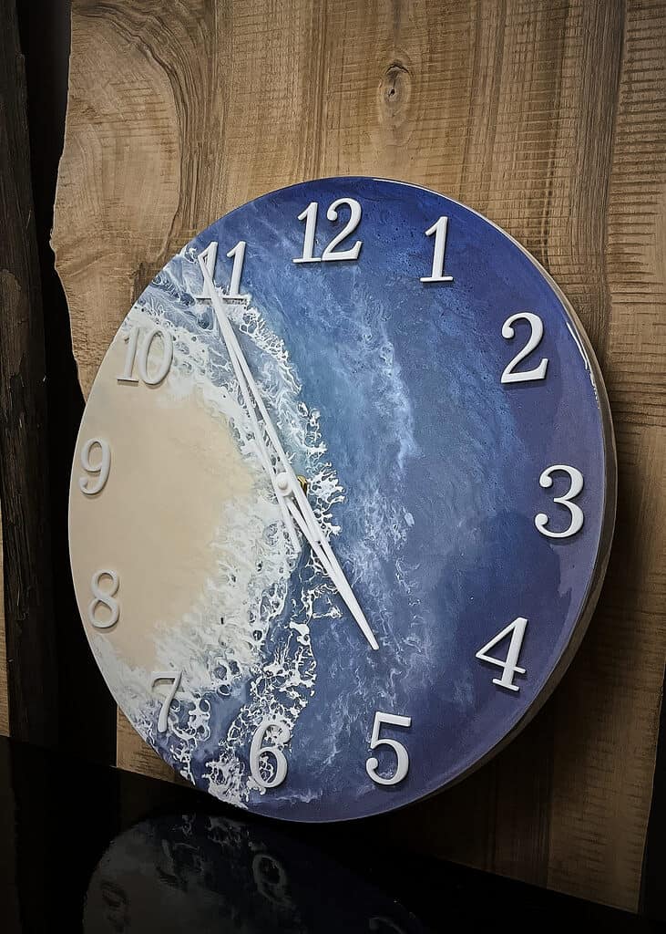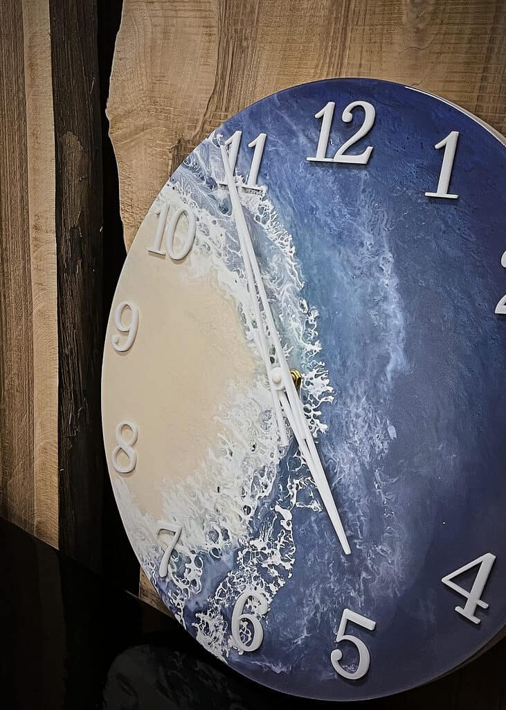 Przedstawiamy nasz wyjątkowy zegar ścienny wykonany z żywicy epoksydowej w stylu morskim, który wprowadzi do Twojego wnętrza świeżość i elegancję.