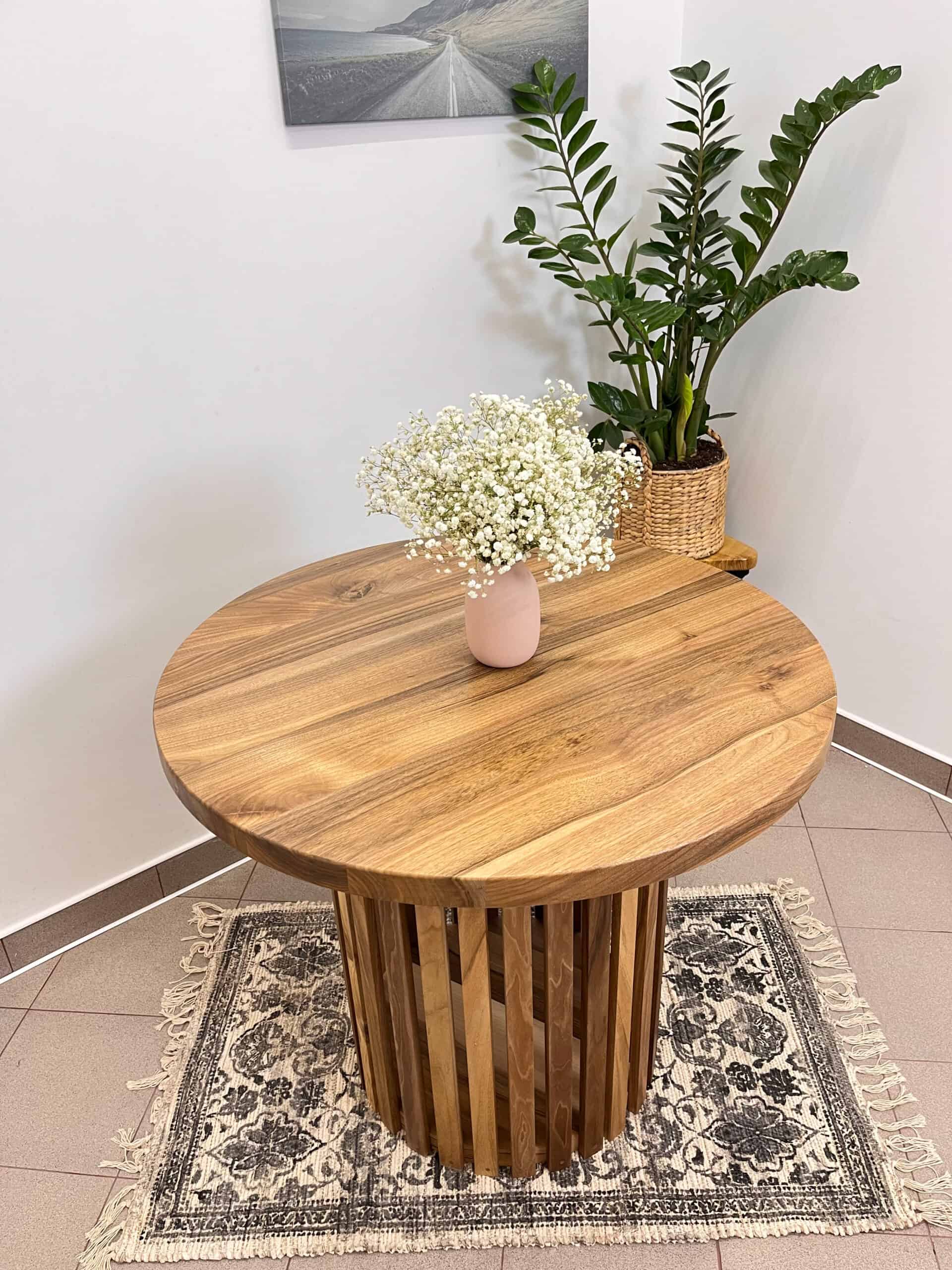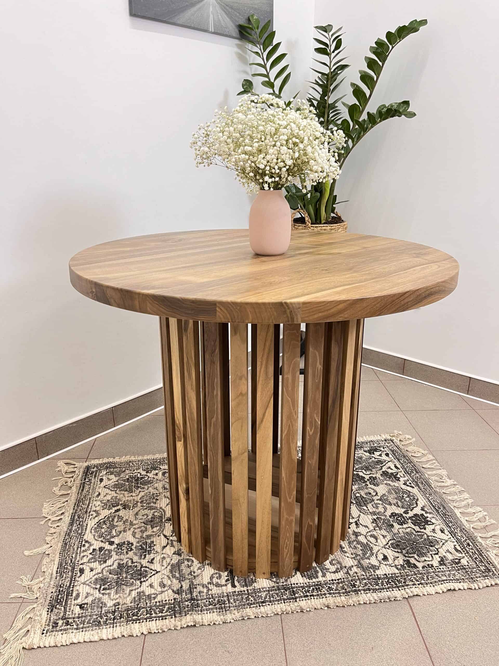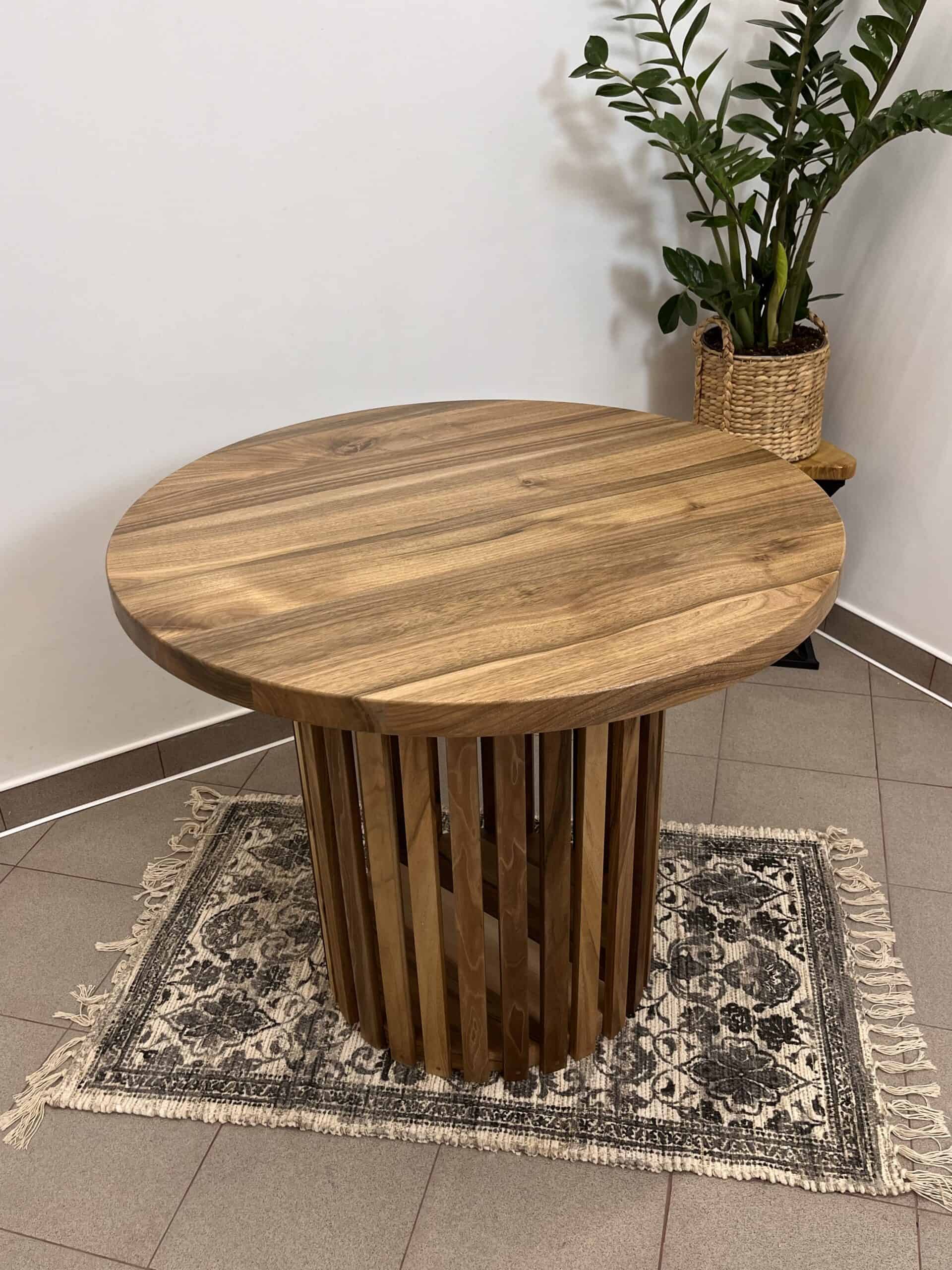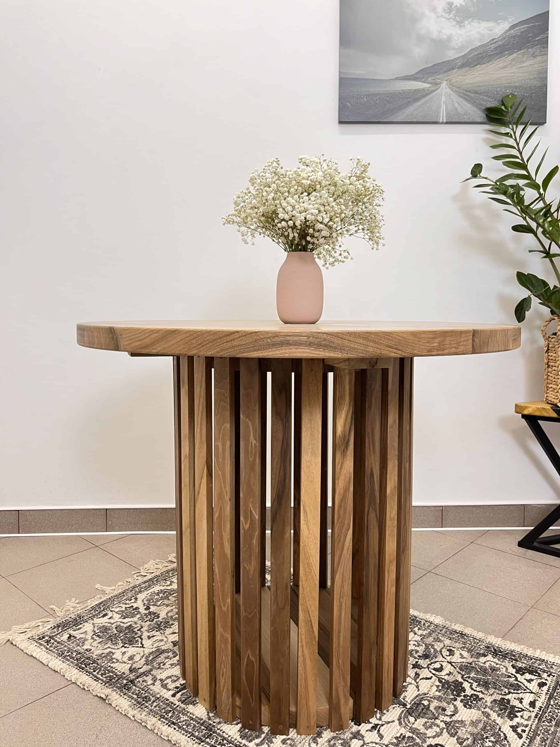 Stolik kawowy w stylu boho jest wykonany z drewna orzecha i dodaje niepowtarzalny urok do każdego pomieszczenia.