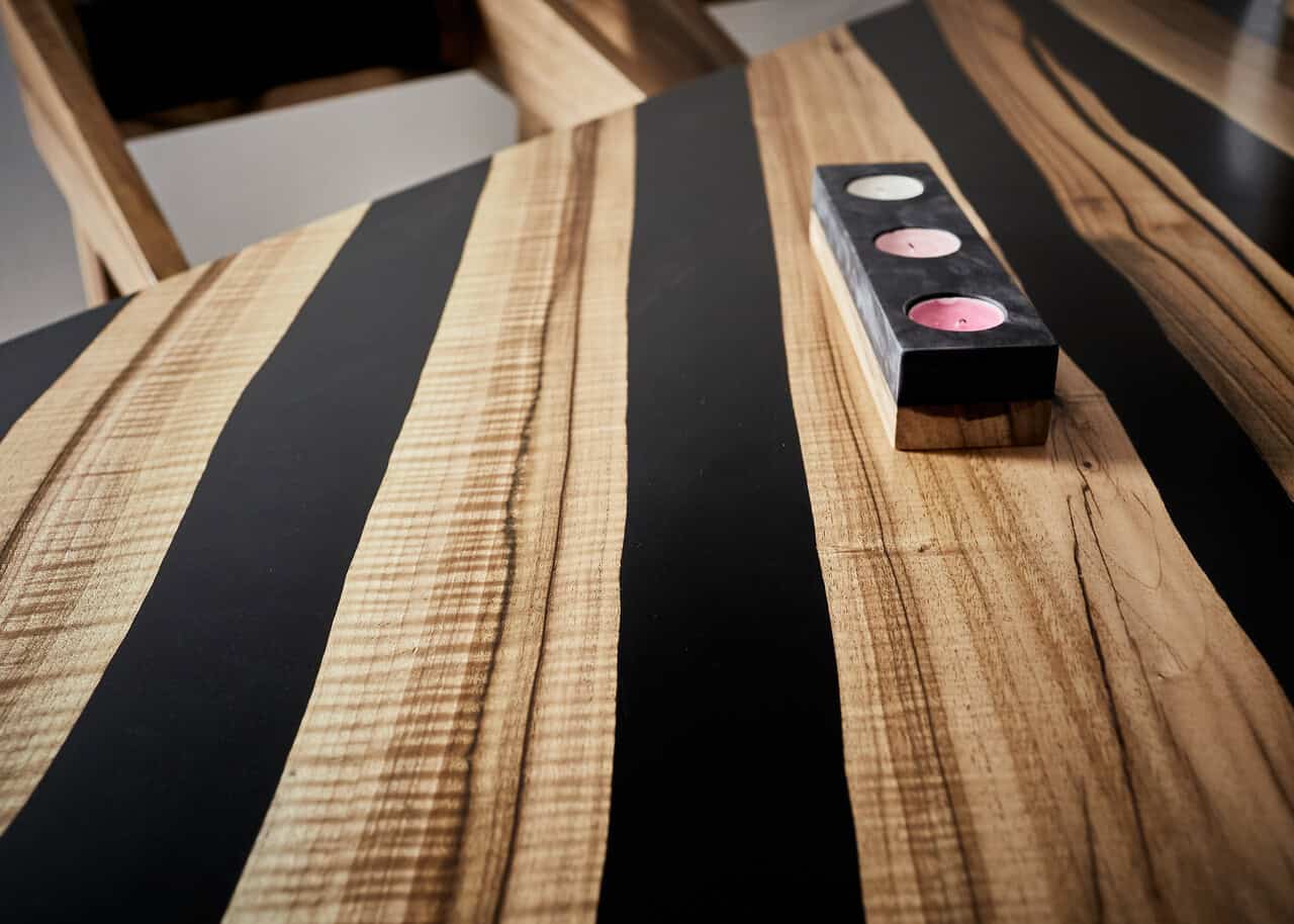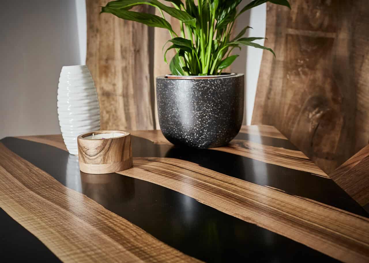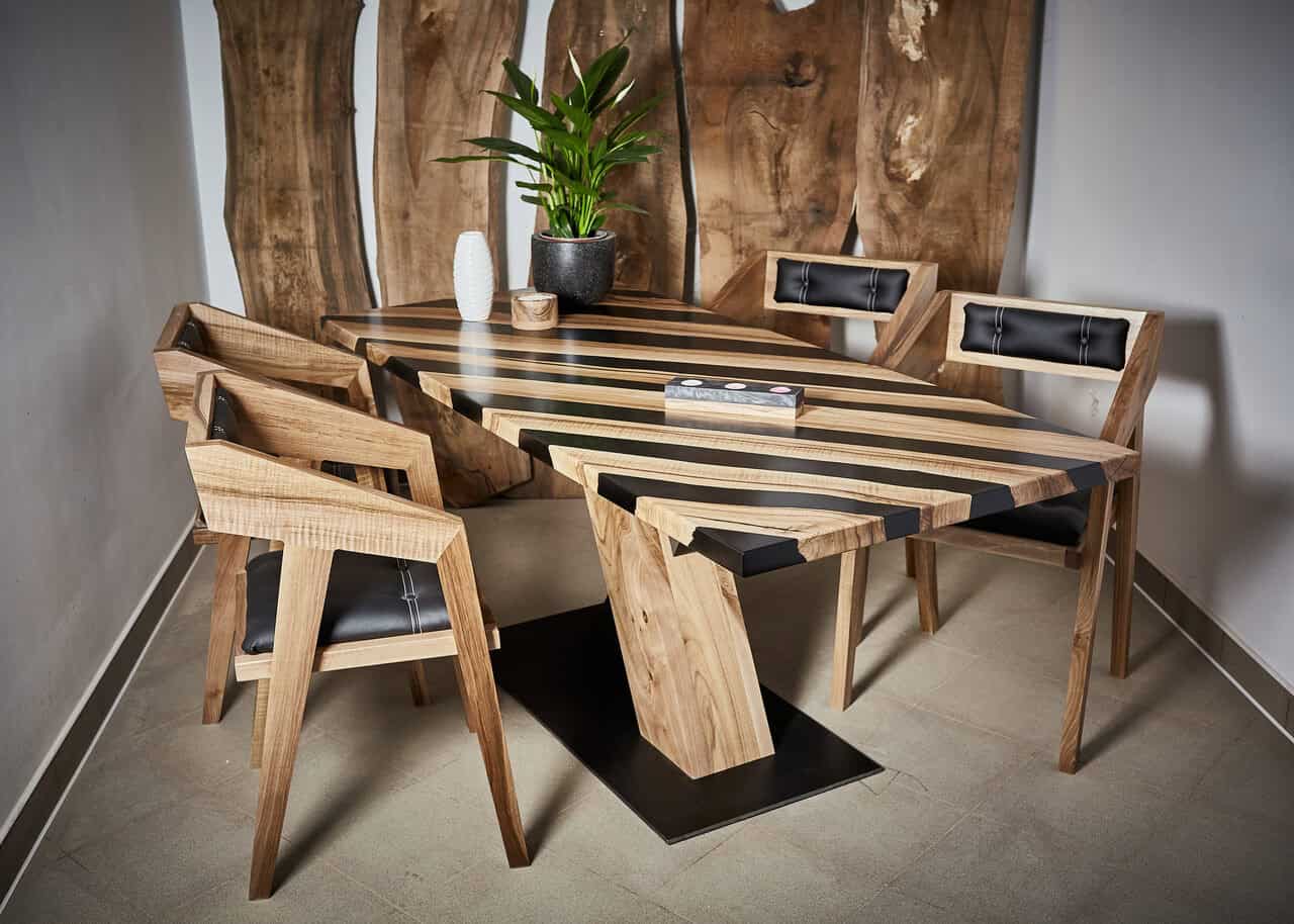 Stół Czarny Agat jest wykonany z drewna orzecha i czarnej żywicy epoksydowej. Nogi stołu – masywny stelaż. Jest możliwość zmiany nóżek na inny kształt.