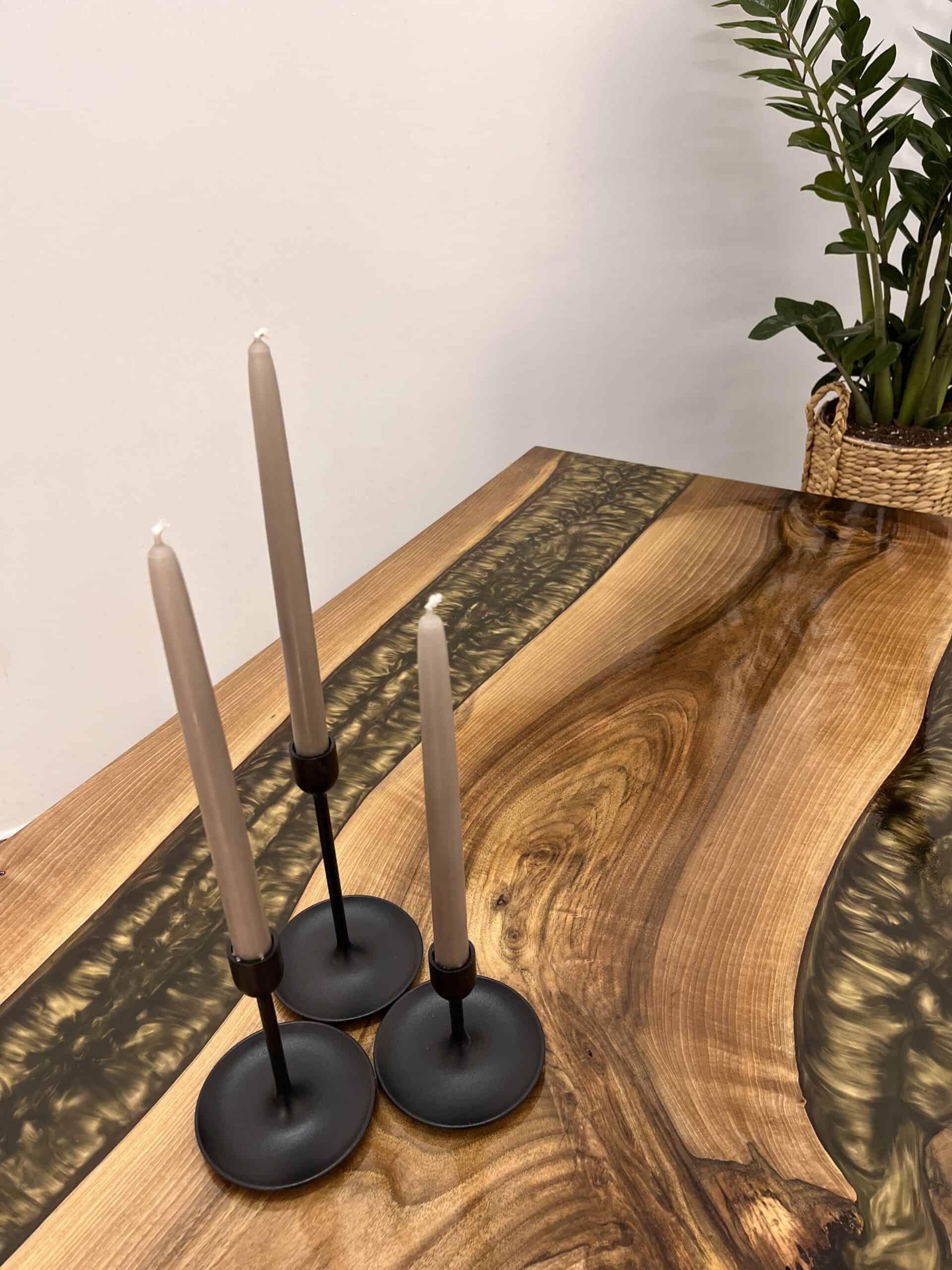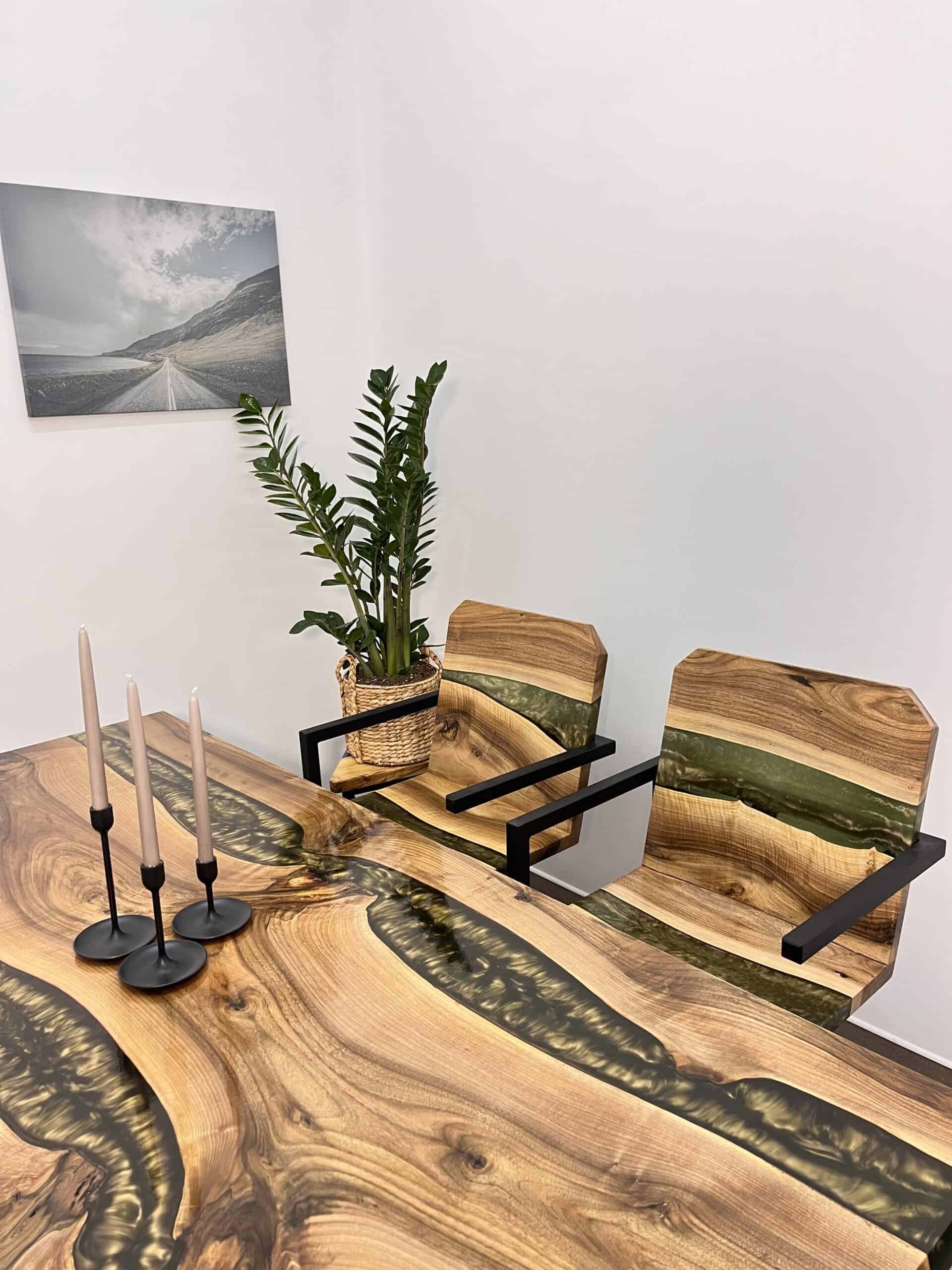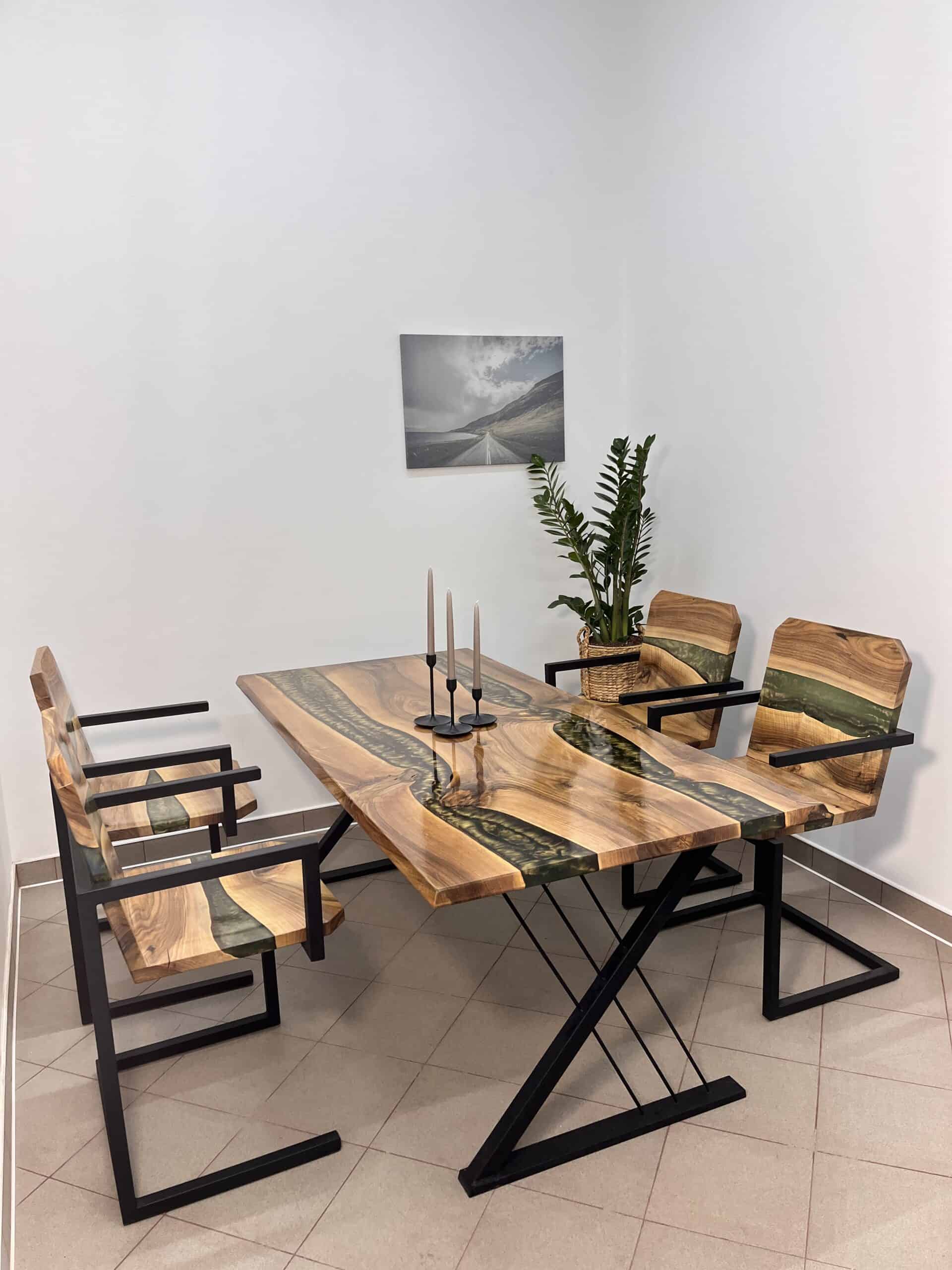 Zestaw Kryształowy został wykonany z drewna orzecha z unikalnym akcentem złotej żywicy epoksydowej, która łączy naturalne piękno drewna z nowoczesnym designem. Podstawa jest wykonana z wysokiej jakości profilu, pomalowanego na czarny mat.